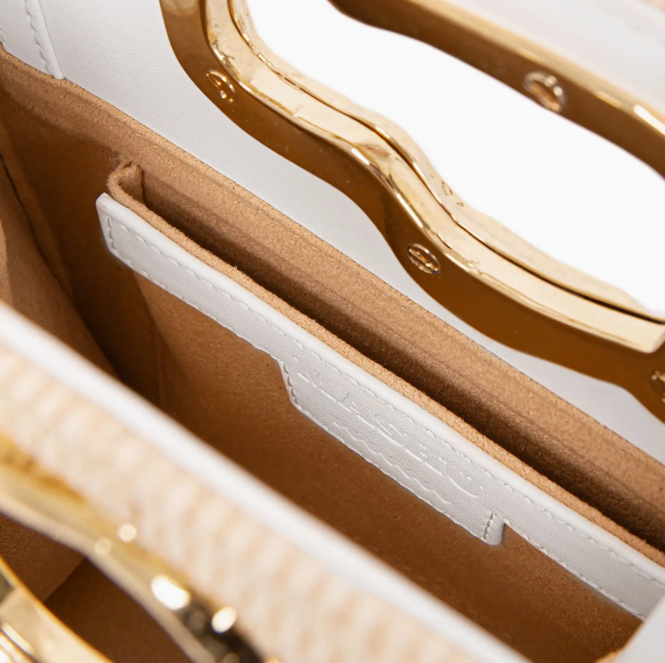 Calliope is a structured mini bag with our signature statement wiggle handle. Wear her open, or close her up via the two snap buttons on the sides.